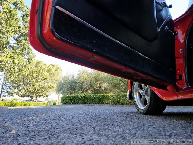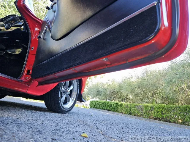 The exterior is finished in Bright Red with a 2-inch front drop and 1-inch rear blocks for a refined stance. It rides on Classic American Racing 5-spoke rims with Nexen N7000 radials (275/40ZR17 rear, 235/45ZR17 front, with 80-90% tread remaining).