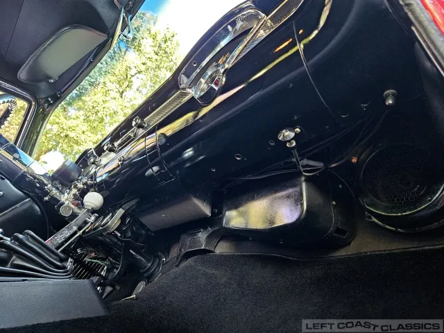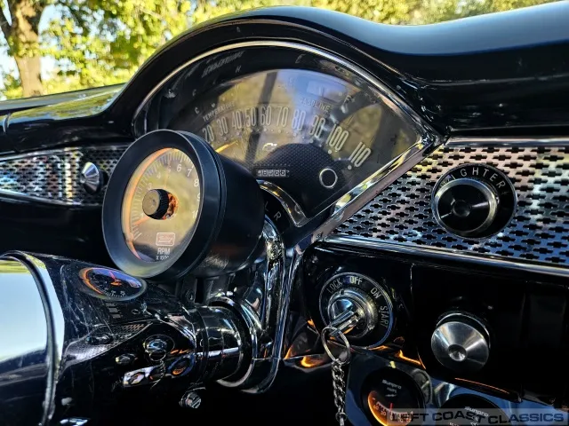 The black interior features low-pile carpeting, cloth seats with front and rear seatbelts, and an Ididit tilt column. Original gauges are bypassed for functional under-dash gauges (amps, oil, temperature—all illuminated) and a Mallory column-mount RPM gauge. It has a Retrosound stereo system with auxiliary input and multiple speakers. All interior components are in good working condition.