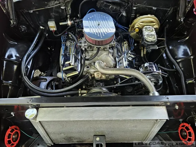 The 350 V8 engine, paired with a Turbo 400 Hydramatic transmission and B&M shift kit, provides robust performance. It features an Edelbrock 4-barrel carburetor, Holley intake manifold, chrome valve covers, and a heavy-duty aluminum radiator.