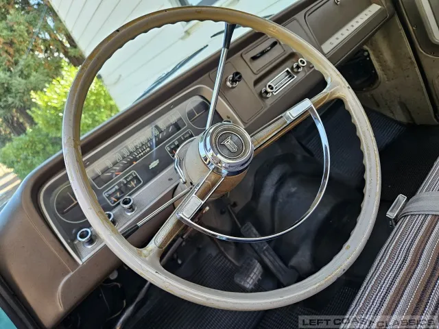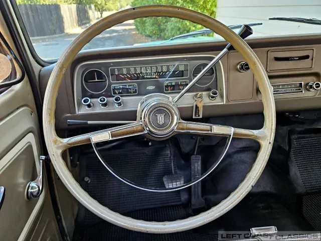 Inside, it’s equally impressive. It still wears its original Fawn vinyl seat cover, with the build sheet still tucked behind the seatback (albeit tattered). A new reproduction seat cover would be a smart idea, though we’ve placed a simple cover over it for preservation. Otherwise, the interior is a true time capsule and a treat to cruise around in.