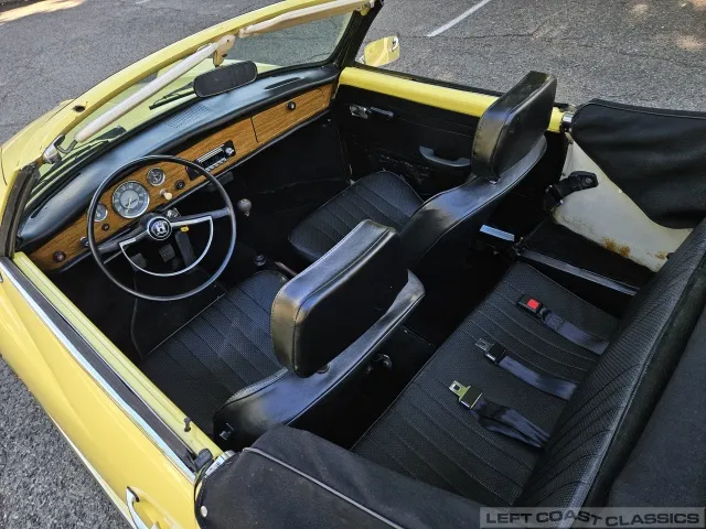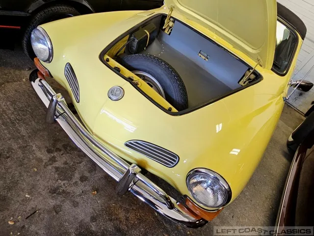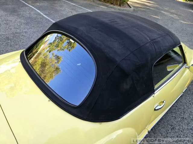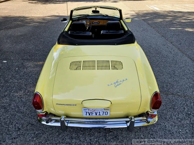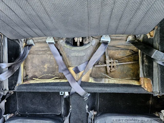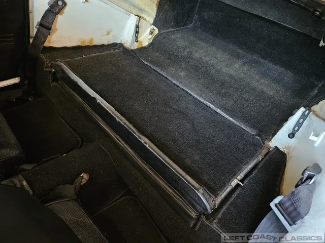 The canvas top, paired with the original headliner, fits well and operates smoothly. It rides on Nexen steel-belted radials with older removable "Porta wall" whitewalls, adding a period-correct look. The undercarriage has been recently refurbished and sealed, though there is very minor degradation at the lower front of the trunk below the spare tire. The trunk is original, equipped with a new liner and spare tire.