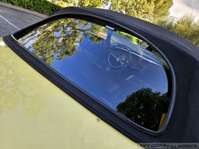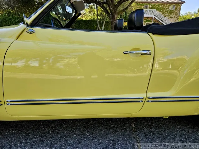 The body sports a consumer-level repaint in its original Shantung Yellow, offering a smooth, glossy finish with minor imperfections. The front nose is unhit, fenders are original, and the side and original glass rear convertible window remain intact. Most chrome and trim are original, showing typical wear for their age.