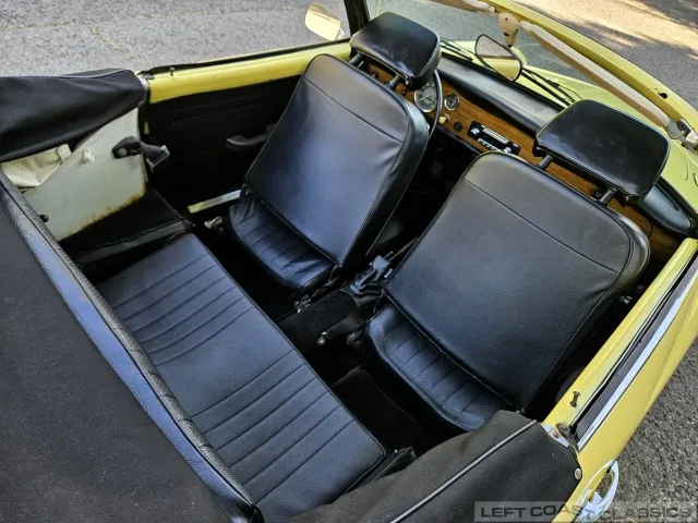 The interior combines original black vinyl with newer carpeting, showing some age but remaining comfortable and presentable. A Hermosa retro radio with Bluetooth and streaming provides modern convenience while maintaining a vintage aesthetic. Gauges and lights function properly, (clock is inoperable), creating a pleasant environment for top-down drives.