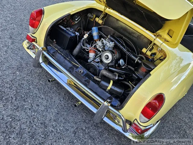 The 4-cylinder air-cooled engine, replaced at some point in the car's history, runs well with compression between 135-145 psi across all cylinders. Recent maintenance includes a full tune-up with new spark plugs, points, fuel filter, valve cover gaskets, vacuum hoses, battery, and oil change. The 4-speed manual transmission shifts smoothly, and the brakes are in good condition, with 75% life remaining at the rear and 65%+ at the front. The car starts easily and handles with the characteristic Karmann Ghia charm.