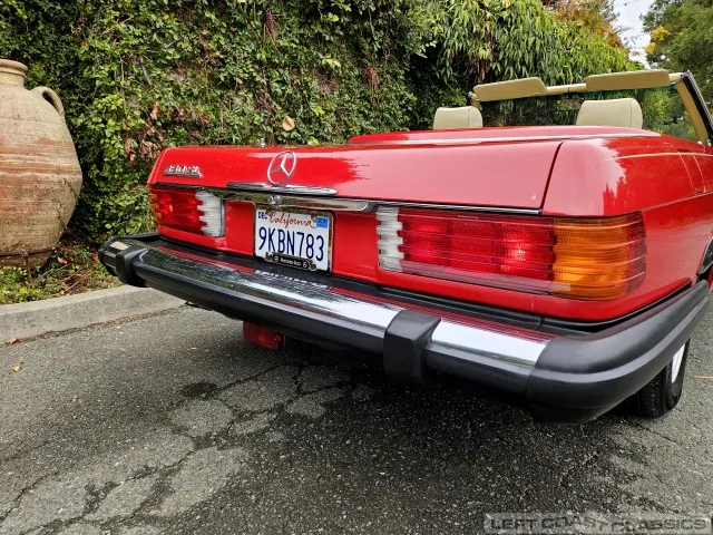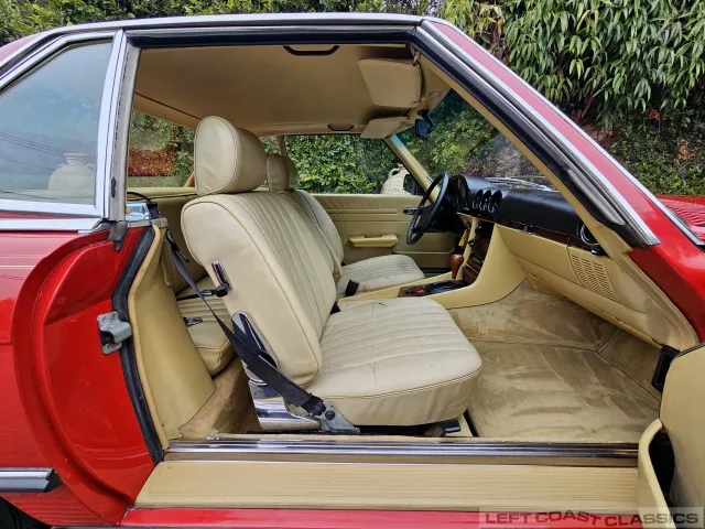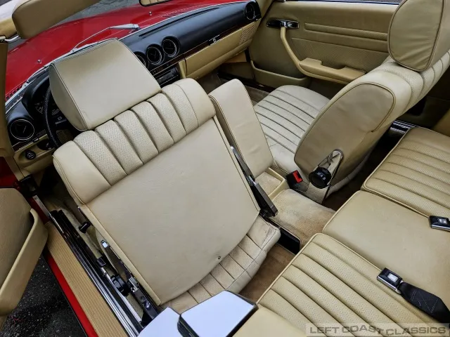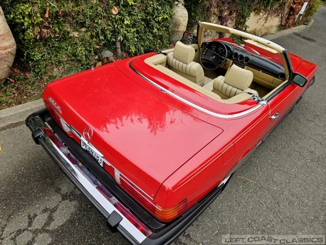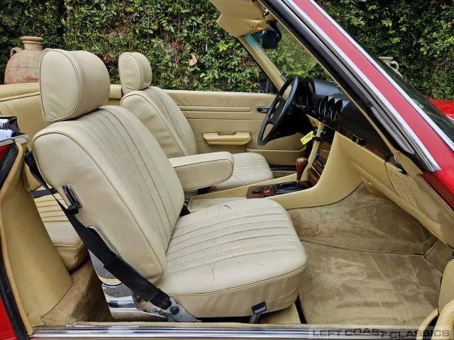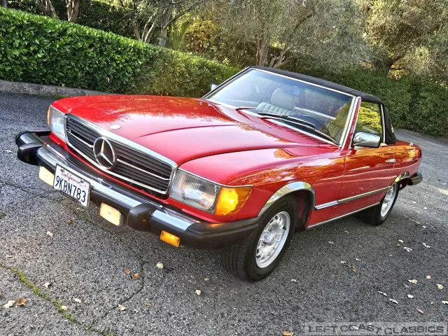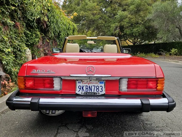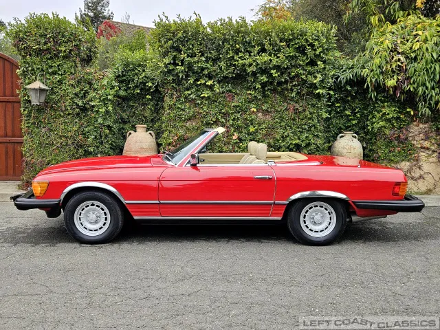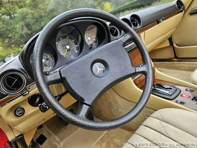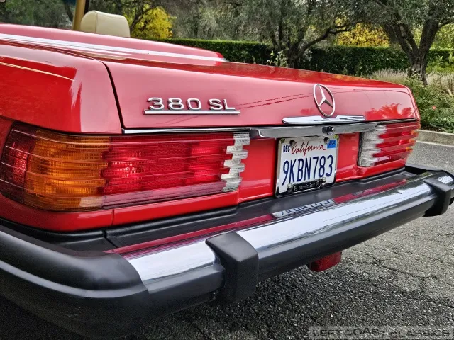 Built in July of 1983 at Mercedes-Benz's Sindelfingen factory and finished new in Signal Red with a Palomino interior. This U.S.-specification 380SL is a later build, benefiting from timing-chain improvements, more refined emissions and drivability tuning, and incremental suspension updates that make them smoother and tighter cars than early examples.