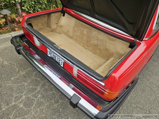 The exterior presents well in its factory color, Signal Red. Brightwork and trim show nicely, glass is in good condition, and the car retains its original 14-inch wheels. The undercarriage is notably clean and dry, with no evidence of rust. The car is equipped with Hankook 205/70 R14 tires, dated 5/19, with 85% tread remaining. The trunk is clean and complete with the spare tire and jack in place.
