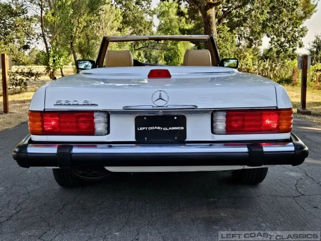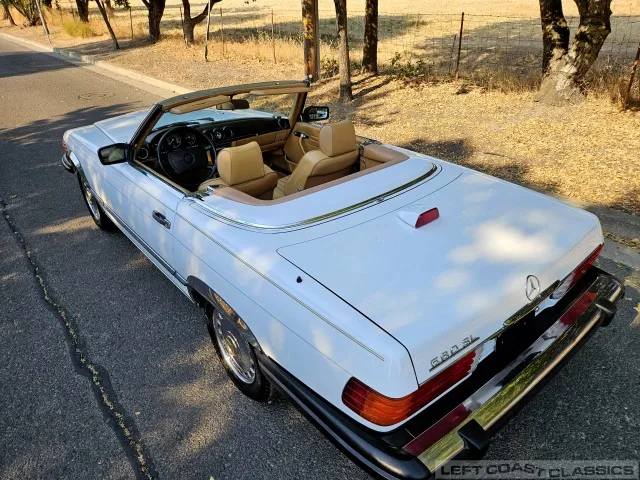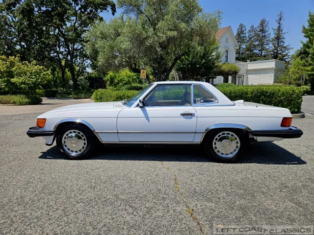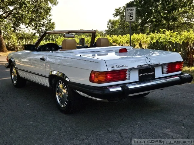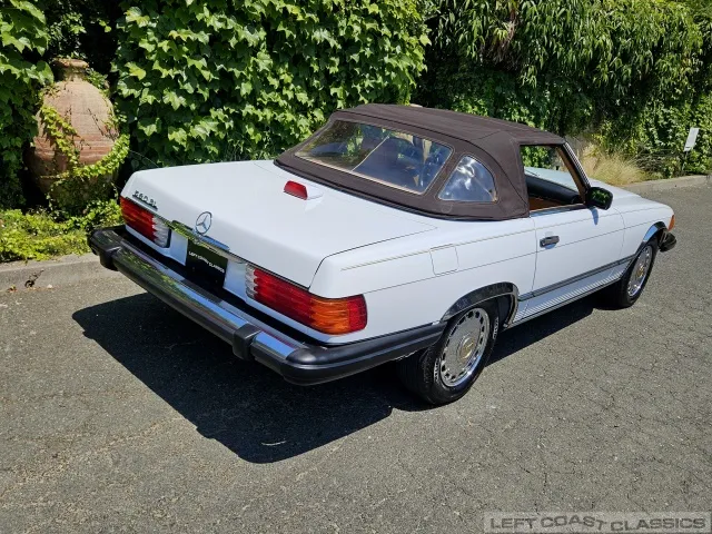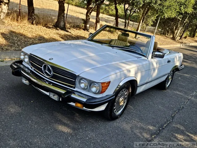 For sale is a striking 1987 Mercedes-Benz 560SL, a true California classic purchased new in September 1987 from Stead Motors in Walnut Creek. Finished in Arctic White with a warm Palomino interior and a dark brown convertible top. It comes with books, manuals, the original data card, and the factory removable hardtop.