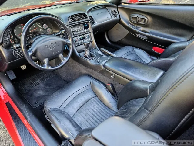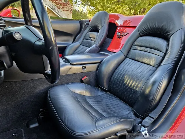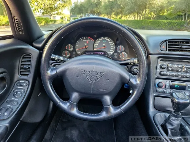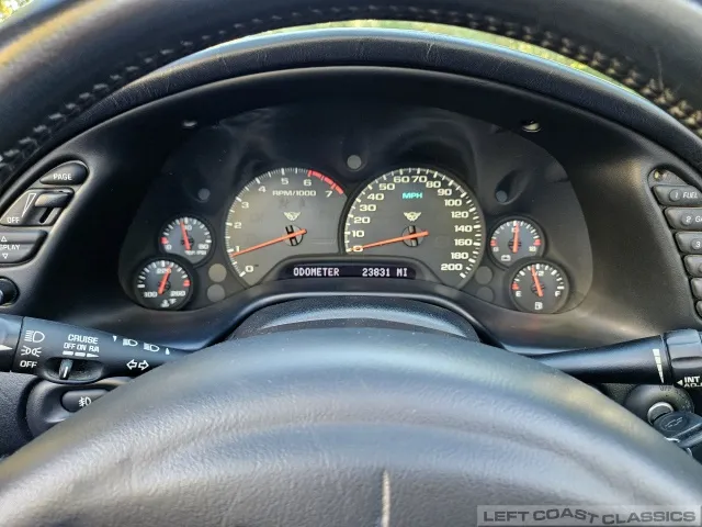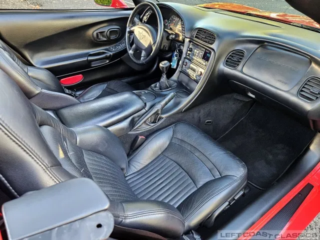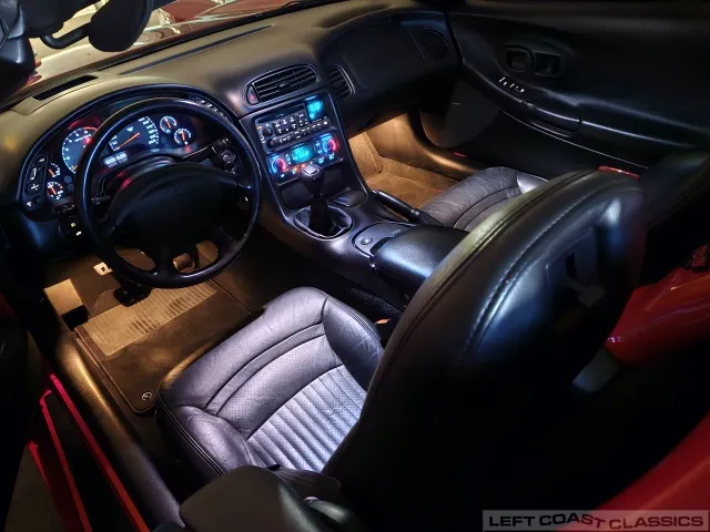 Inside, the black leather cockpit presents in excellent condition—no odors, minimal wear, and a clear indication of careful ownership. The power sport seats retain firm bolsters, the leather remains soft, and all switchgear works properly. Equipment includes dual-zone automatic climate control, memory settings for the driver’s seat and mirrors, keyless entry with alarm, power windows and locks, illuminated storage, and a premium Bose sound system with a remote 12-disc CD changer. It’s a non-smoker car that feels and smells as clean as it looks—one of the finer C5 interiors you’ll find.