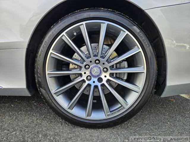 The exterior presents beautifully. The Iridium Silver Metallic finish exhibits deep gloss and mirror-like reflection, perfectly complemented by the black convertible top for a timeless and sophisticated look. The 20-inch AMG multispoke wheels provide a refined yet athletic stance and are wrapped in Pirelli all-season tires (245/45R20 front, 275/35R20 rear).