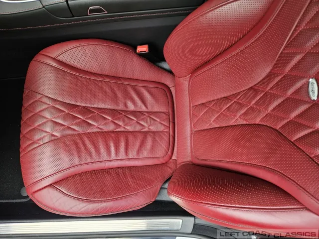 Inside, the cabin is a masterpiece finished in designo Bengal Red/Black Exclusive Nappa Leather. The deep, dark red upholstery wraps the seats, doors, and dash in hand-stitched leather contrasted by black accents, polished metal trim, a Dinamica headliner, and fine wood veneers—creating an atmosphere of warmth and sophistication.