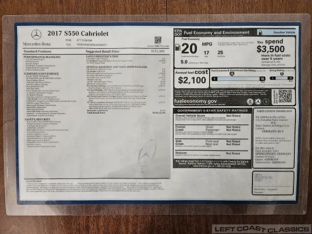 Beautiful 2017 Mercedes-Benz S550 Cabriolet for sale. This highly optioned example was sold new on December 27, 2016, at Mercedes-Benz of Marin in San Rafael, California, with a retail price of $154,125.