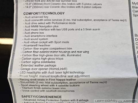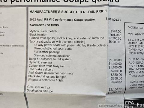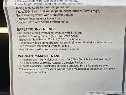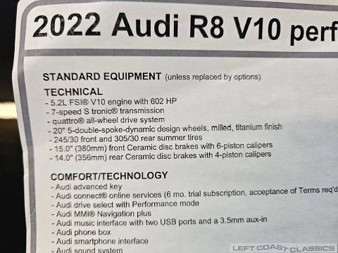View close-up detailed photos of this 2022 Audi R8 Quattro's interior, engine, undercarriage and body. This stunning highly optioned V10 Quattro is for sale from Left Coast Classics in Sonoma California