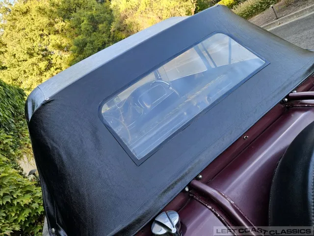 The paint is older, shiny but weathered, with patina and flaws that suit its vintage character. Chrome trim presents well and appears to have been refinished at some point. The original steel wheels have also been refinished, wearing factory hubcaps and Classic Radial LL880 165/80 R15 tires with about 95% tread remaining. The top, side curtains, tonneau, and spare tire cover are all in very good shape.