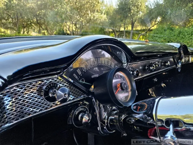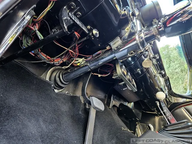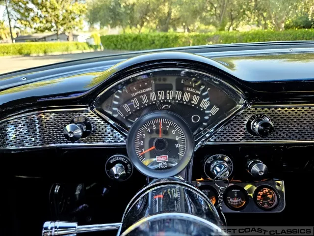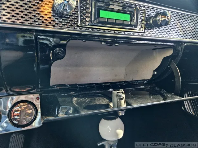 The black interior features low-pile carpeting, cloth seats with front and rear seatbelts, and an Ididit tilt column. Original gauges are bypassed for functional under-dash gauges (amps, oil, temperature—all illuminated) and a Mallory column-mount RPM gauge. It has a Retrosound stereo system with auxiliary input and multiple speakers. All interior components are in good working condition.