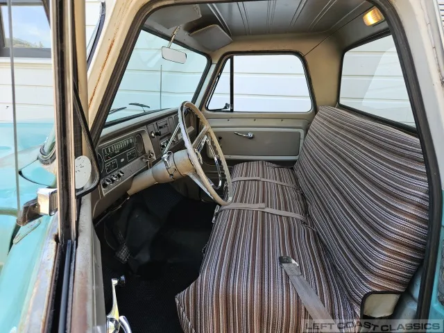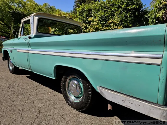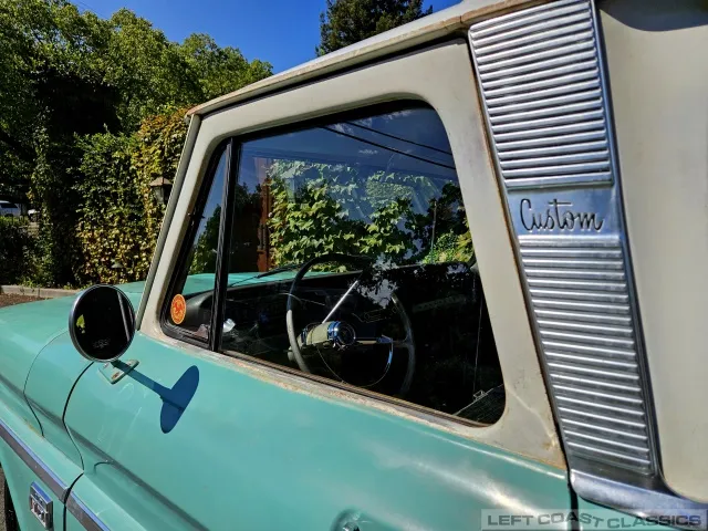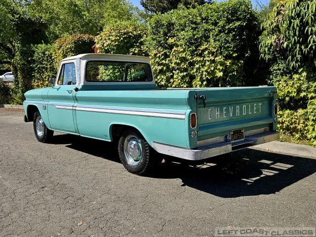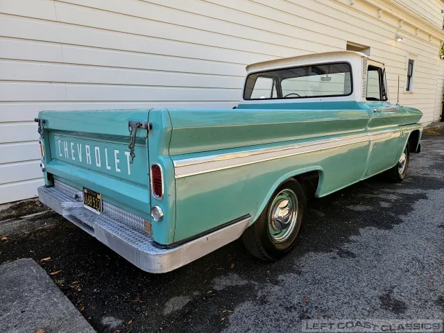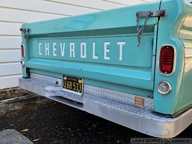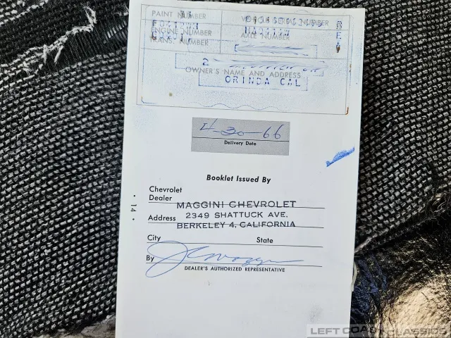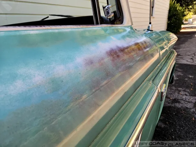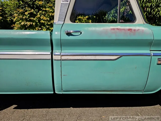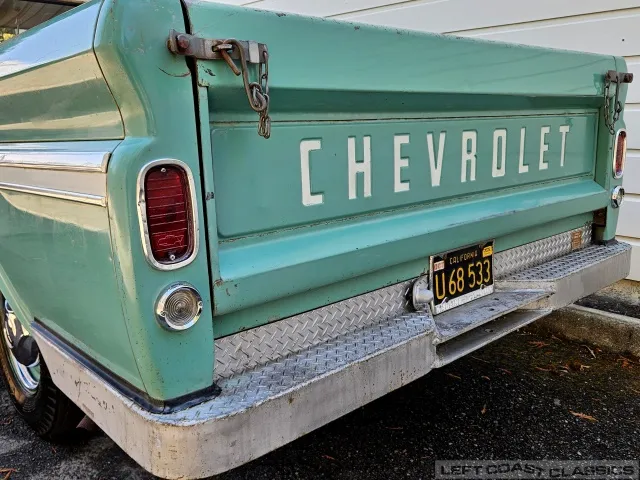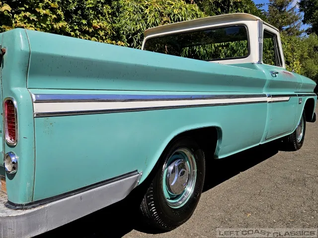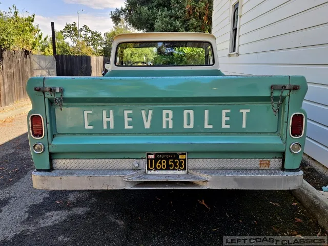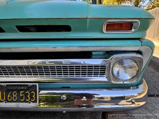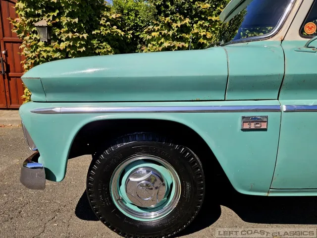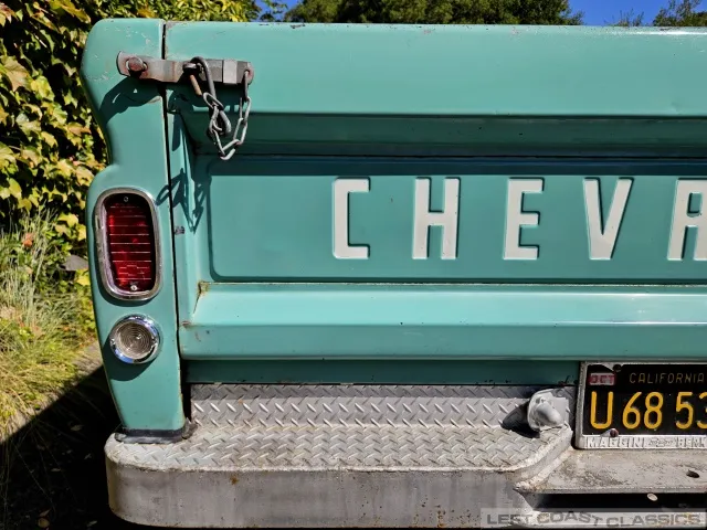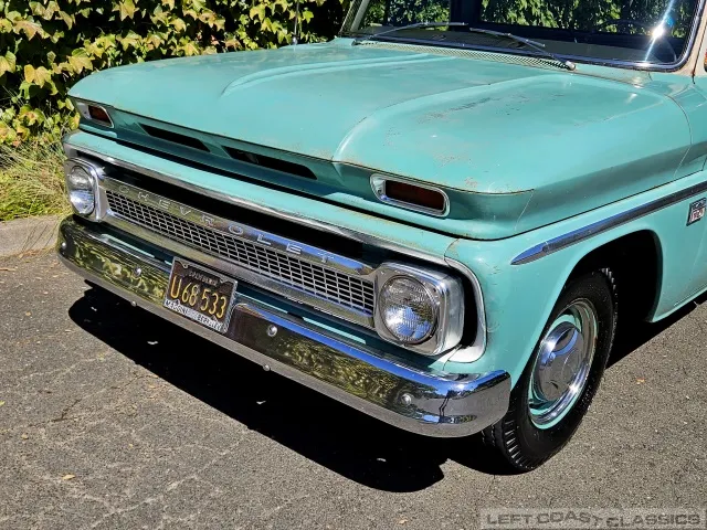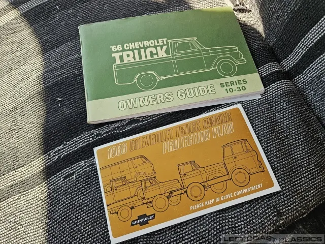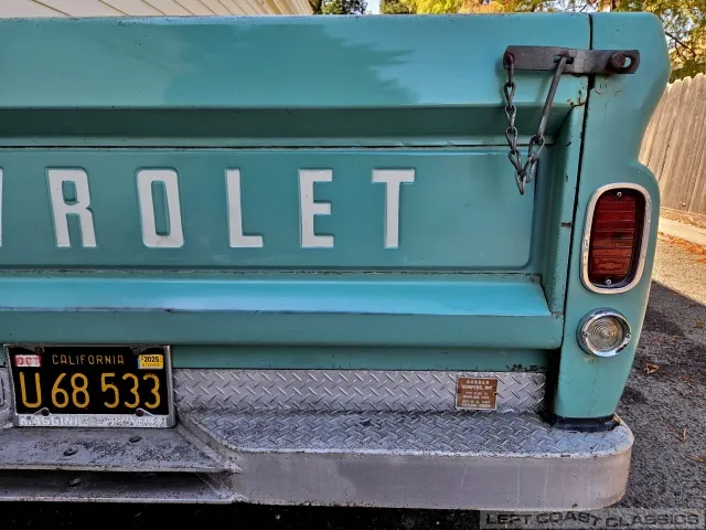 Super original 1966 Chevrolet C10 for sale. This amazing California truck was purchased new on April 30, 1966, at Maggini Chevrolet, Berkeley, California. It remains finished in its original Fathom Turquoise and White, with a well-preserved, all-original Fawn Metallic interior and mostly intact Fawn vinyl upholstery. It includes its original owner’s guide, Protection Plan booklet, data sheet, and Protect-O-Plate.