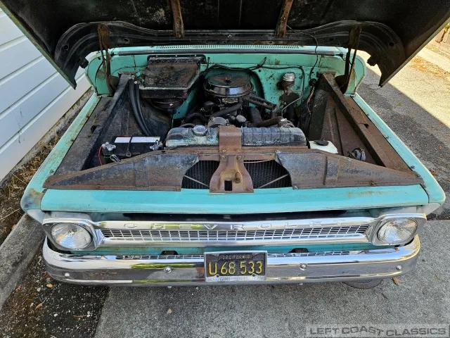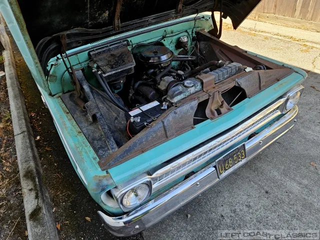 The original High-Torque 283-cubic-inch V8 starts quickly and runs strong. It appears to have never been out of the truck. The Powerglide automatic transmission shifts smoothly, and the truck handles well. Under the hood, everything remains highly original, with no signs of over-restoration or rattle-can paint — just pure and honest.
