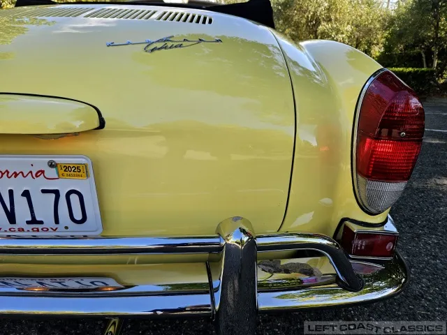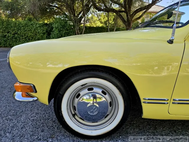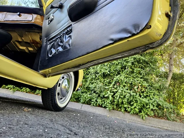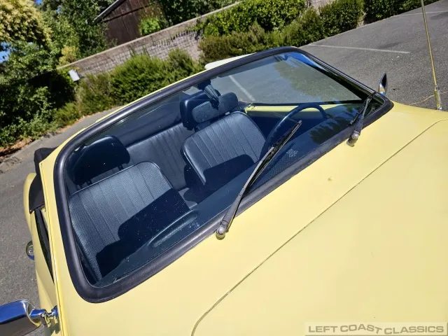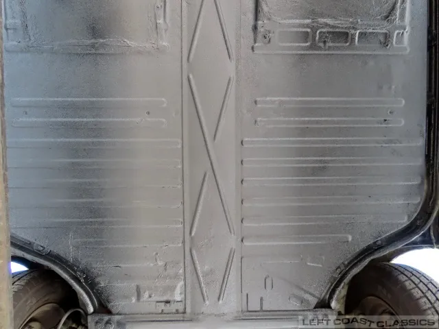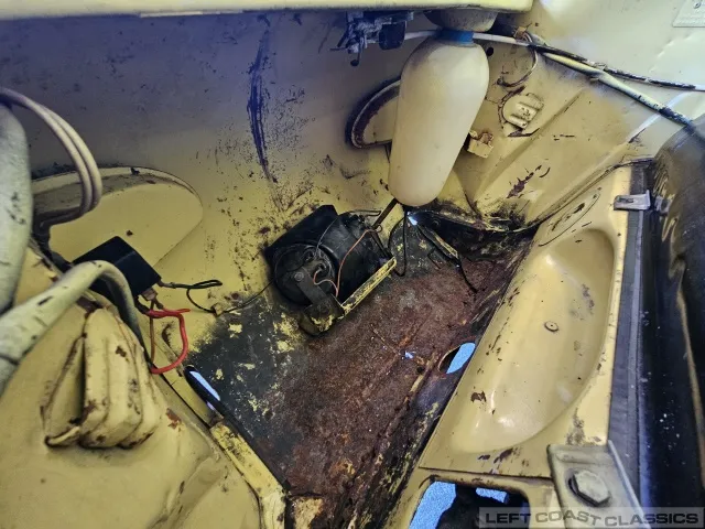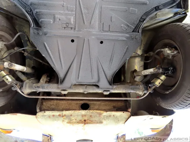 The canvas top, paired with the original headliner, fits well and operates smoothly. It rides on Nexen steel-belted radials with older removable "Porta wall" whitewalls, adding a period-correct look. The undercarriage has been recently refurbished and sealed, though there is very minor degradation at the lower front of the trunk below the spare tire. The trunk is original, equipped with a new liner and spare tire.