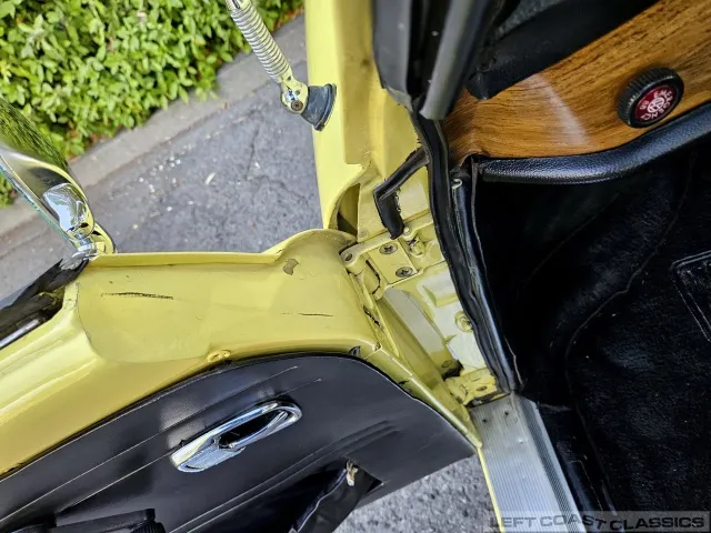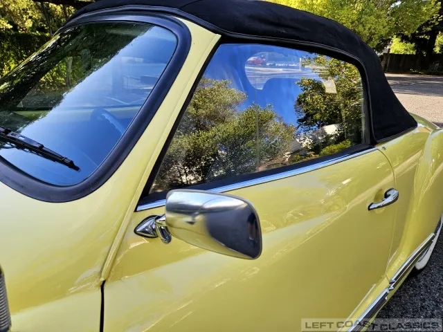 The body sports a consumer-level repaint in its original Shantung Yellow, offering a smooth, glossy finish with minor imperfections. The front nose is unhit, fenders are original, and the side and original glass rear convertible window remain intact. Most chrome and trim are original, showing typical wear for their age.