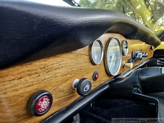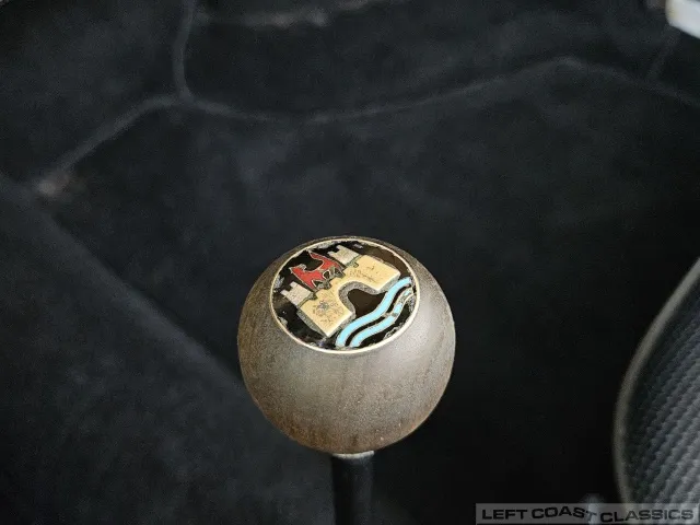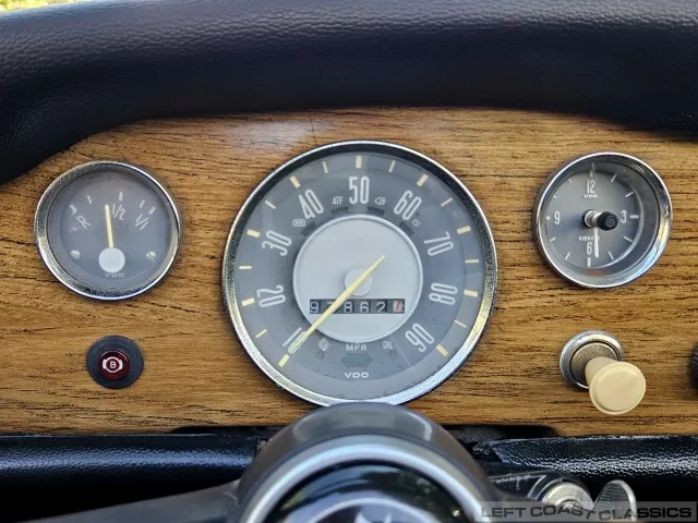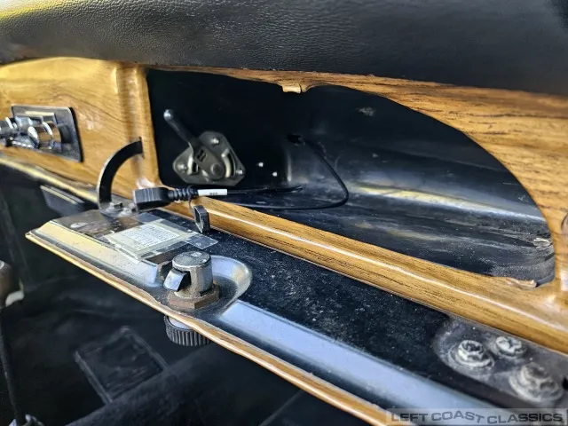 The interior combines original black vinyl with newer carpeting, showing some age but remaining comfortable and presentable. A Hermosa retro radio with Bluetooth and streaming provides modern convenience while maintaining a vintage aesthetic. Gauges and lights function properly, (clock is inoperable), creating a pleasant environment for top-down drives.
