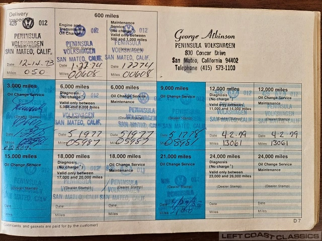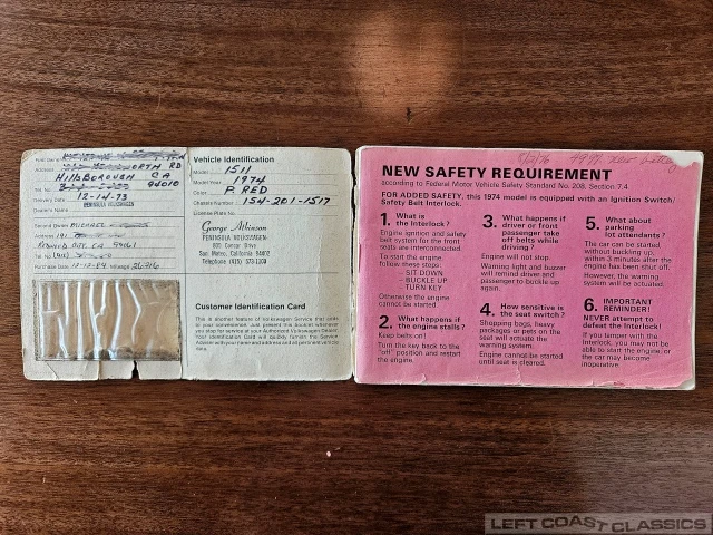 Originally delivered on December 14, 1973 by Peninsula Volkswagen of San Mateo, California, the car has spent its life in Northern California. Included with the car are the original owner’s manual, dealer service booklet with stamps from Peninsula Volkswagen, and a small collection of historical registration and service records.
