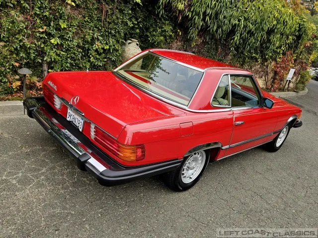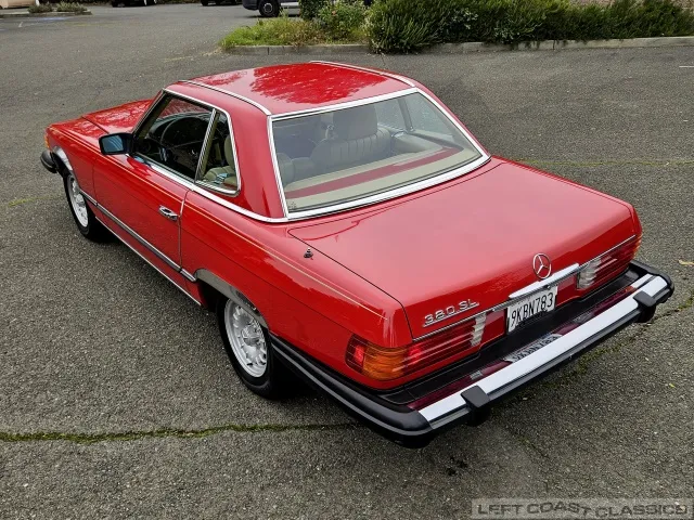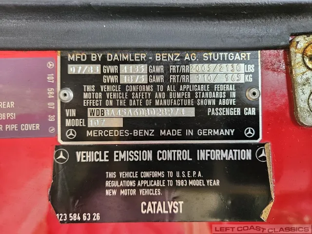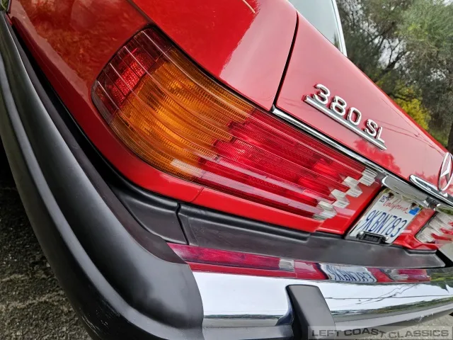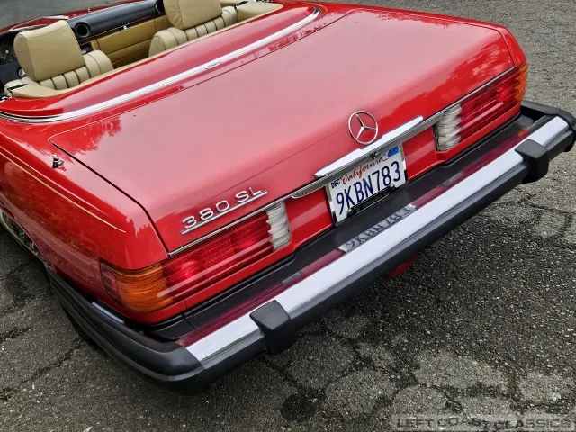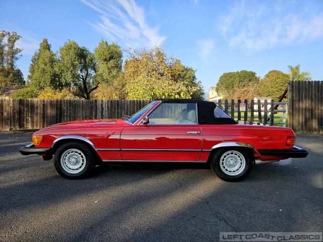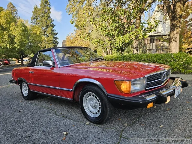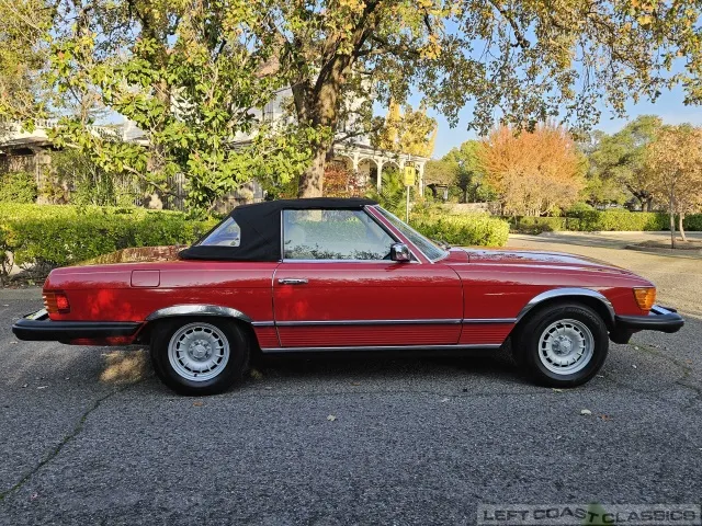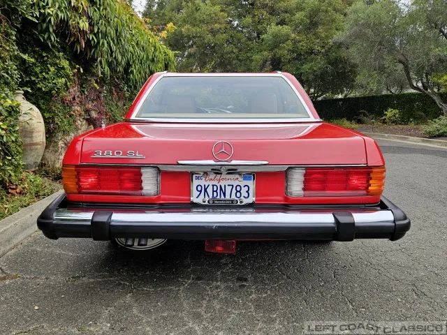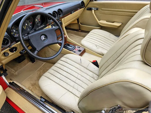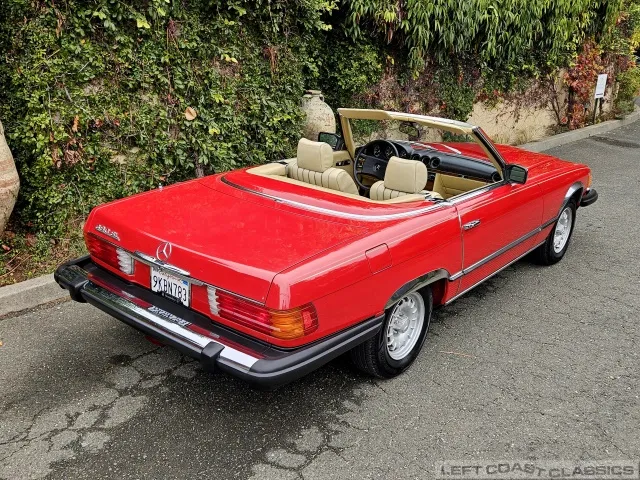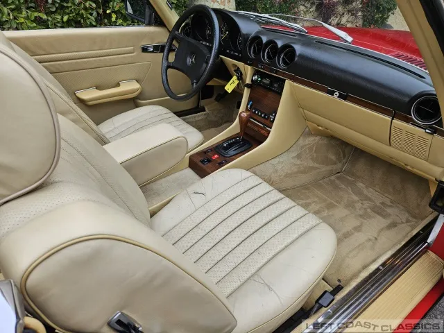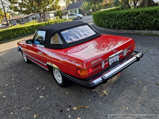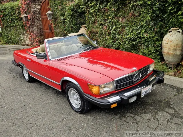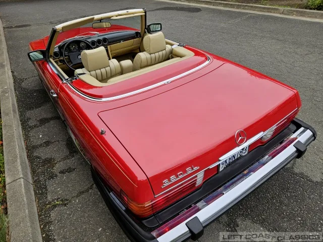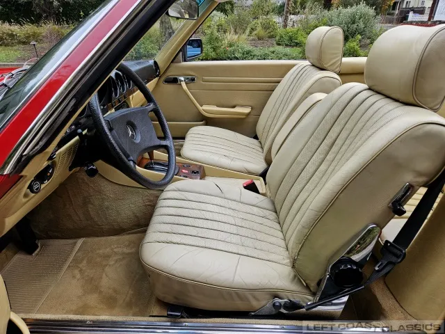 Built in July of 1983 at Mercedes-Benz's Sindelfingen factory and finished new in Signal Red with a Palomino interior. This U.S.-specification 380SL is a later build, benefiting from timing-chain improvements, more refined emissions and drivability tuning, and incremental suspension updates that make them smoother and tighter cars than early examples.