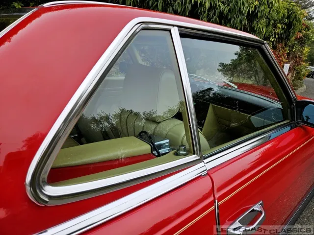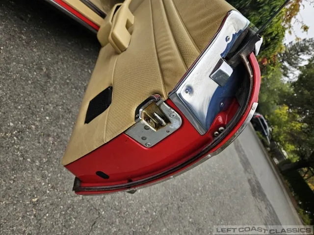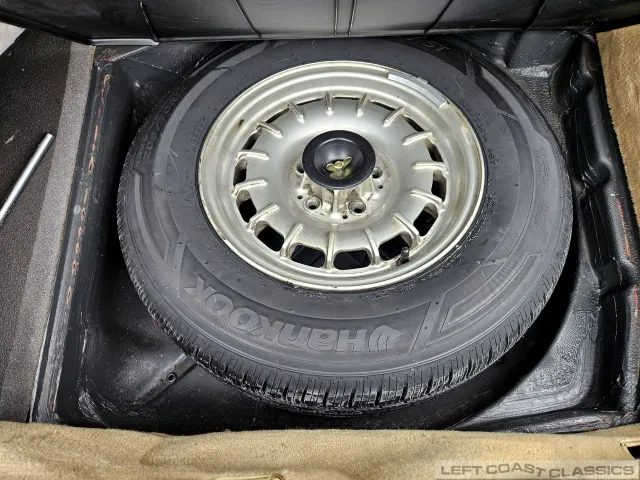 The exterior presents well in its factory color, Signal Red. Brightwork and trim show nicely, glass is in good condition, and the car retains its original 14-inch wheels. The undercarriage is notably clean and dry, with no evidence of rust. The car is equipped with Hankook 205/70 R14 tires, dated 5/19, with 85% tread remaining. The trunk is clean and complete with the spare tire and jack in place.
