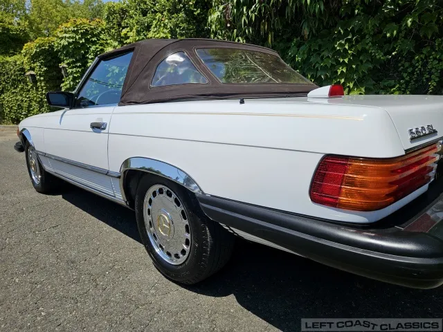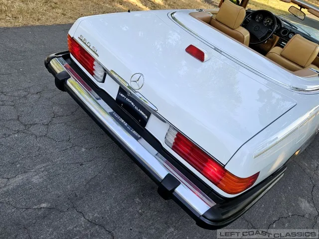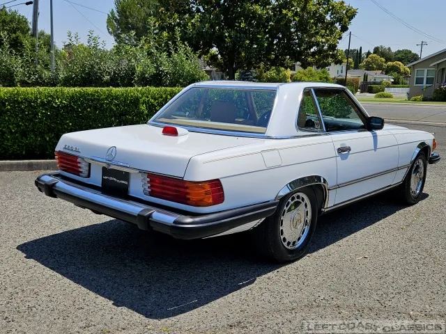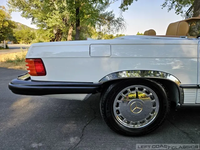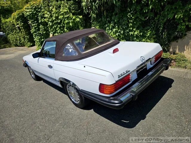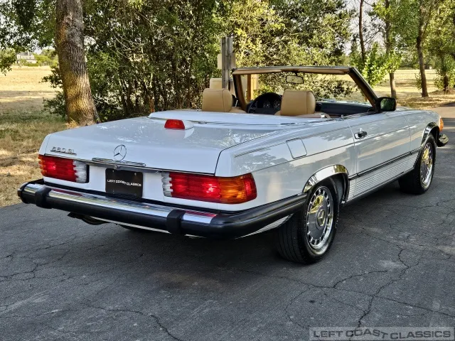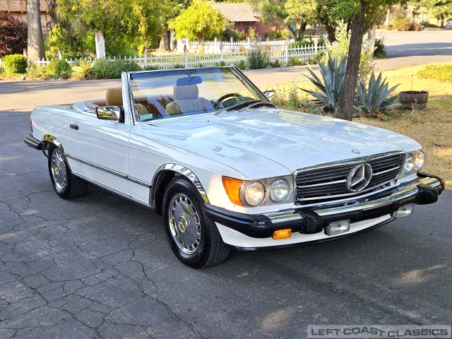 For sale is a striking 1987 Mercedes-Benz 560SL, a true California classic purchased new in September 1987 from Stead Motors in Walnut Creek. Finished in Arctic White with a warm Palomino interior and a dark brown convertible top. It comes with books, manuals, the original data card, and the factory removable hardtop.
