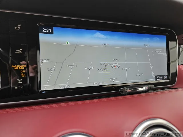 Inside, the cabin is a masterpiece finished in designo Bengal Red/Black Exclusive Nappa Leather. The deep, dark red upholstery wraps the seats, doors, and dash in hand-stitched leather contrasted by black accents, polished metal trim, a Dinamica headliner, and fine wood veneers—creating an atmosphere of warmth and sophistication.