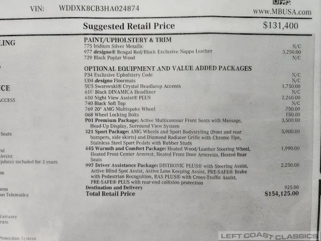 It’s equipped with the Premium Package (Active Multicontour Front Seats with Massage, Head-Up Display, Surround View System), Sport Package (AMG Wheels and Sport Body Styling with unique bumpers and side skirts, Diamond Radiator Grille, Stainless Pedals, and Swarovski® Crystal Headlamp Accents), Night View Assist® PLUS, 20" AMG Multispoke Wheels, Driver Assistance Package (DISTRONIC PLUS®, Active Lane Keeping Assist, PRE-SAFE® Brake with Pedestrian Recognition, Cross-Traffic Assist), and the Warmth & Comfort Package (Heated Wood/Leather Steering Wheel, Heated Armrests, Heated Rear Seats), among many other premium features.