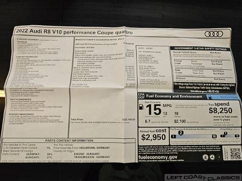 View close-up detailed photos of this 2022 Audi R8 Quattro's interior, engine, undercarriage and body. This stunning highly optioned V10 Quattro is for sale from Left Coast Classics in Sonoma California